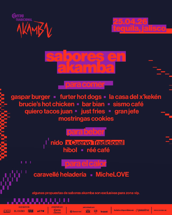 La propuesta gastronómica de Akamba 2026, al igual que el circuito de arte y la música, forma parte de la experiencia sensorial completa del festival, y está pensada para asegurar un repertorio diverso, local y adecuado para contar con la energía suficiente de principio a fin en un evento de esta magnitud, lleno de sorpresas y con lo mejor de la música club a nivel global.