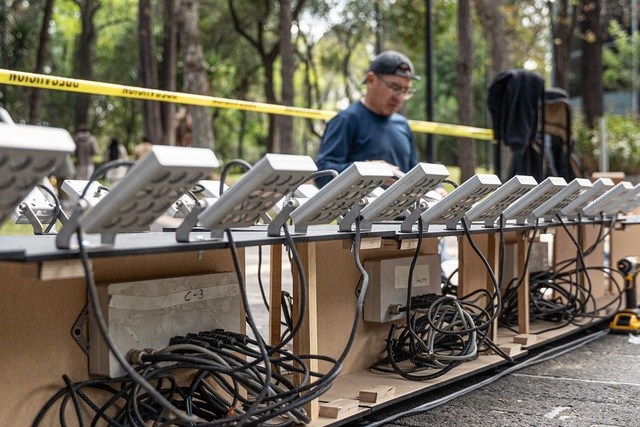 Lozano-Hemmer resaltó que el montaje incorpora diversas medidas de protección ambiental: todas las fuentes de luz cuentan con filtros de corte ultravioleta (UV) para evitar la desorientación de aves migratorias; las luminarias del trayecto operan con energía solar y el uso de sistemas LED de alta eficiencia permite mantener un consumo energético mínimo.