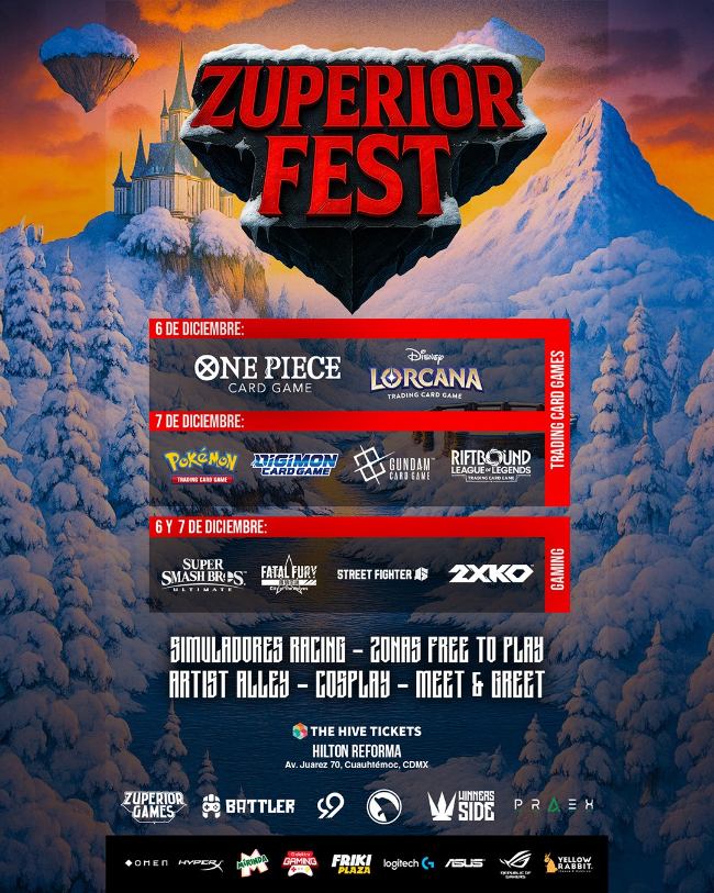 Hoy, títulos como One Piece Card Game, Disney Lorcana, Pokémon TCG, Digimon, Gundam y propuestas recientes como Riftbound TCG funcionan como pequeñas economías creativas, cada una con su propio estilo. Zuperior Fest se diseña con esa base y suma simuladores racing, Artist Valley, cosplay, activaciones, meet & greets, marcas invitadas, zonas de gaming libre y actividades para el fan del coleccionismo, el gamer casual, el competidor de esports o quien simplemente quiera divertirse.